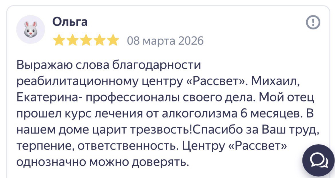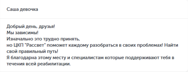 Здравствуйте! Ребята после 12лет употребление наконец то я трезвый я выздоравливаю! Это счастье! Самые лучшие психилоги терапевты! Максим А Михаил С. Вобщем ребята я очень рад что попал в Рассвет! И еще для меня самое главное что там оооооооочень вкусно кормят!