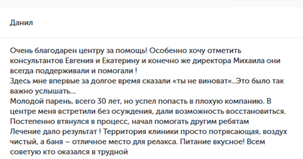 Этот центр порекомендовал мне брат, который находится в трезвости уже 2,5 года. Своим примером трезвой жизни показал мне возможность получить профессиональную помощь в данном центре. Благодаря квалифицированной работе специалистов, находясь в центре, я получил много полезных знаний и навыков. В настоящее время веду трезвый образ жизни и не жалею о том, что обратился именно в этот центр, спасибо!