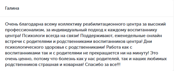 Огромная благодарность специалистам центра! Профессиональные психологи, которые всегда рядом как с реабилитантом, так и на связи с семьей!